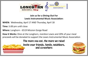 Are you feeling tired? Not in the mood to cook dinner? Well you are in luck! The Lewis Instrumental Music Association invites you to our Dining Out TWO-DAY event at Longhorn Bar & Grill.